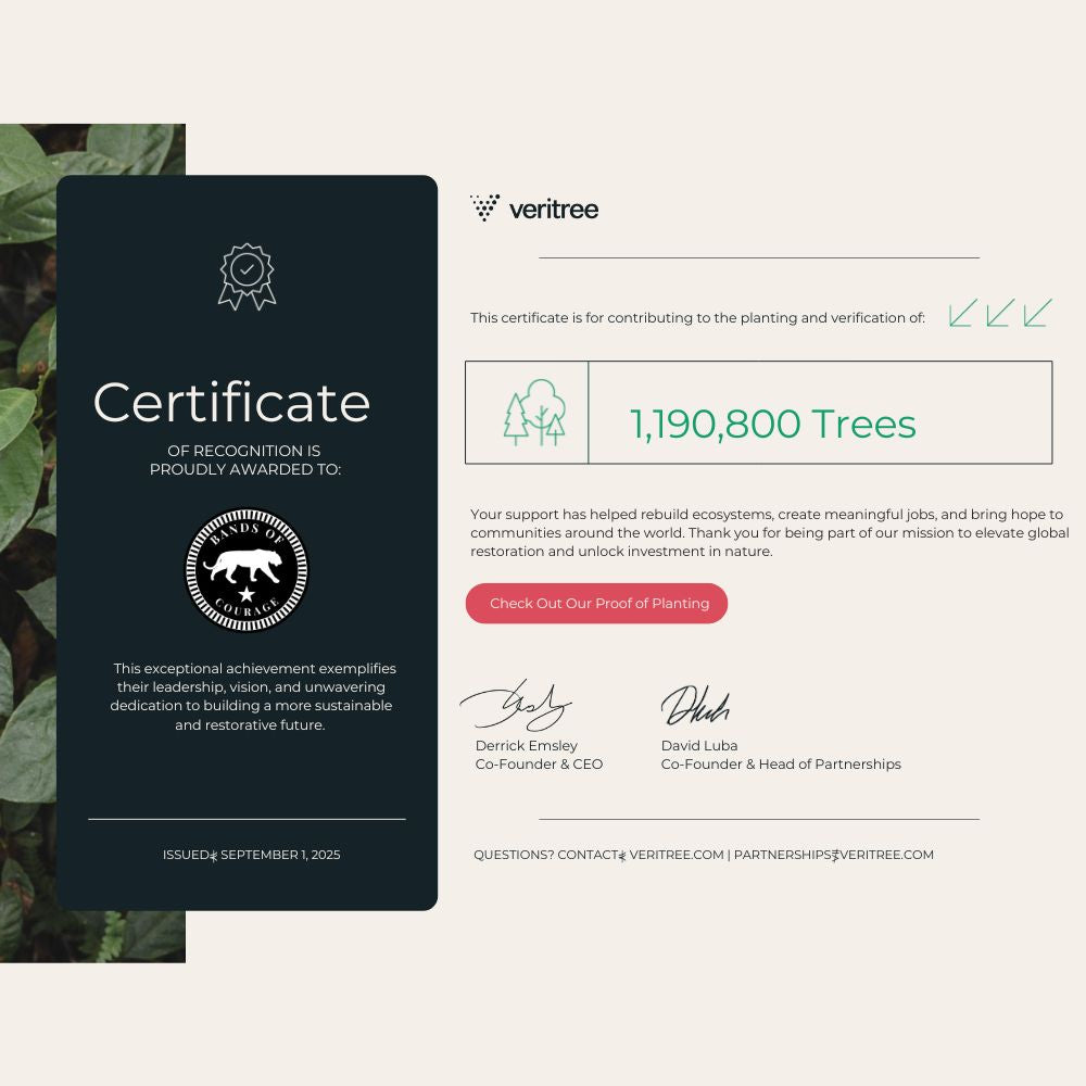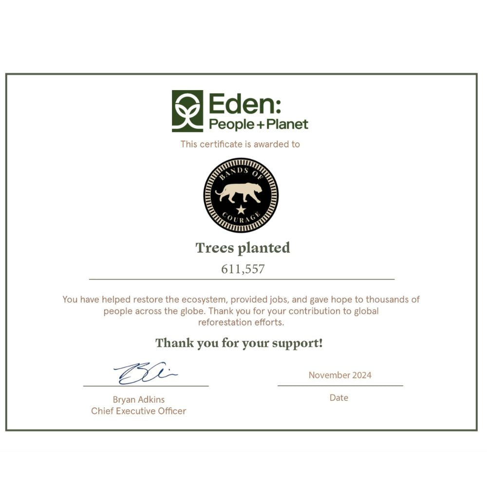 Every Band of Courage plants 10 Mangrove trees, and comes with a 10 Tree Planting Certificate telling you all about your trees, where they're planted, and how much Carbon Dioxide you have recycled.